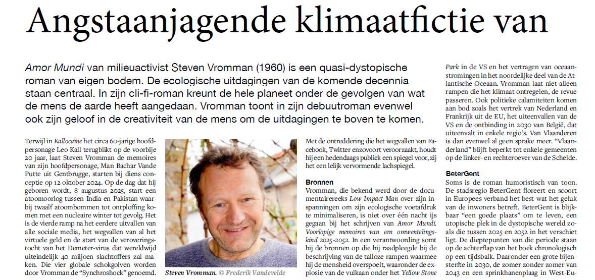 Welkom in Amor Mundi, de toekomstroman van Steven Vromman, ook bekend als Low Impact Man, de milieuactivist die probeert zijn ecologische voetafdruk te minimaliseren. De roman is zowel een nachtmerrie die je laat beleven wat er gebeurt als klimaatverandering gierend uit de hand loopt als de voorstelling van een gedroomde samenleving die de natuur ademruimte biedt. De personages in het boek zijn niet bang van drastische maatregelen om het tij van klimaatverandering en biodiversiteitsverlies te keren. Zo saboteren ze het geldsysteem om de machine van zinloze speculatie en de zucht naar almaar meer te doen stokken. En een activist van de Byte Backbeweging die de vleesconsumptie wil tegengaan, zet een teek uit die je allergisch maakt voor vlees. In een internationaal proces bekent hij schuld, maar er volgt toch vrijspraak, want dankzij de aanslag op de vleesconsumptie zijn er geen hongersnoden.