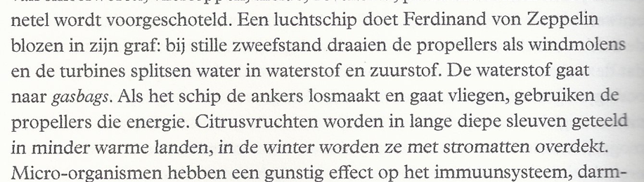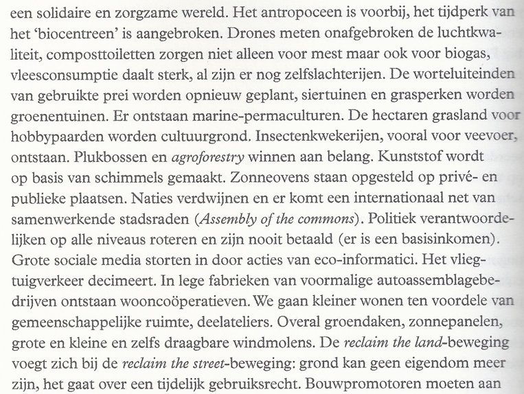 Om met de positie te beginnen: Vromman vult met dit boek een leemte in het ecologisme in. Het doet wat de groene partijen alvast in dit land systematisch verzuimen te doen: hij levert een krachtig narratief over hoe een ecologische wereld er uit zou kunnen zien. Daarbij zoomt hij voortdurend in en uit en weet hij het persoonlijke te koppelen aan het systemische – nog iets waarin de politieke ecologisten falen.