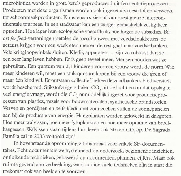 Niet dat het een verhaaltje is geworden over de bloemetjes en de bijtjes waartussen groene jongens en meisjes huppelen en waarin iedereen het plots eens is over de te volgen koers. Bepaald niet. Vromman schetst een utopie tegen de achtergrond van een dystopie – en dat laatste is letterlijk te nemen. Er is geen ecologische of sociale ramp te bedenken of ze passeert de revue. Te beginnen met een nucleaire oorlog. Maar ook regenbommen komen er in voor – soms lijkt het alsof God (het Lot, de Toekomst – kies maar) Steven Vromman al een avantpremière gunde. In werkelijkheid heeft de auteur natuurlijk gewoon zijn huiswerk goed gedaan en veel wetenschappelijke lectuur doorgenomen.