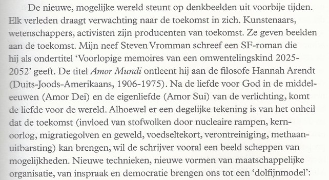 Achterin Amor Mundi staat een lange lijst met personages. Die heb je als lezer ook wel nodig. Het boek is vooral een verkenning van wat ons door klimaatverandering te wachten staat en een oefening in denken over een andere samenleving die niet streeft naar instant behoeftebevrediging maar naar een eenvoudig, creatief en zinvol leven in harmonie met Moeder Aarde. Wie zich wil verliezen in een verhaal over complexe, levensechte karakters komt iets minder aan de trekken. Maar dat neemt niet weg dat het boek flink wat stof tot nadenken biedt en er veel plezier aan te beleven valt. Bijvoorbeeld aan het idee dat in 2043 een campagne voor handen schudden en tongzoenen begint, om de biodiversiteit in de mond te bevorderen. En Gentenaars kunnen er hun hart aan ophalen. Als Vrommans dromen