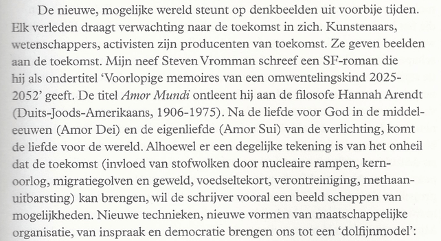 Maar wie de Low Impact Man een beetje kent, weet ook dat hij bij alle kommer en kwel zijn gevoel voor humor niet verliest. Een John die een Yoko leert kennen, een zeppelin die ‘Aeromodeller’ wordt genoemd, het zijn maar twee van vele knipoogjes. Belangrijker nog is dat de schrijver ook in de meest uitzichtloze situaties met speelse creatieve ideeën op de proppen komt (lintbebossing, geenrichtingsstraten, droomkwekerijen, dolfijnleiders…) om de balans tussen distopie en utopie te herstellen en te laten zien dat het spel nog niet gespeeld is. ‘Amor Mundi’ is, eerder dan een roman, een dubbel scenario: aan de ene kant een rampscenario, aan de andere kant een scenario dat een uitweg biedt. De rode draad in het boek is de wissel: welk spoor zullen we nemen?