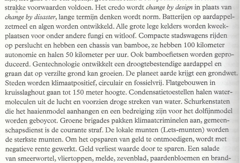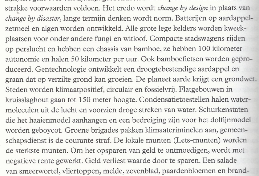 Hij bouwt verder op bestaande alternatieve leefvormen en technologieën die uitgroeien tot mainstream activiteiten. De accelerator hiervoor zijn de Social Media Black Out en de Virtual Money Miss. Wat blijft over als er wereldwijd, niemand meer, beschikt over (virtueel) geld? Wat doe je als je van de ene op de andere dag moet leven zonder de constante prikkels van sociale media? Dan ontstaan er duurzame initiatieven vanuit gemeenschapszin. Als bewoner van Gent, las ik met plezier hoe BeterGent een uitdijende groeiende stadsregio wordt en zelfs op wereldschaal betekenis en invloed heeft. België bestaat intussen niet meer. De eerste Zeeuwse vluchtelingen nemen hun intrek in de fabriekshallen van Volvo. Door het verdwijnen van het geld kunnen namelijk geen ‘klassieke’ auto’s meer worden gekocht want rijden met dergelijke auto’s is niet meer verantwoord. Er zijn wel alternatieve deel-auto’s. Later ontstaat op het Volvoterrein een nieuw stadsdeel met bijna zevenhonderd zelfgebouwde woningen. In de hallen zijn volkskeukens, wassalons, ateliers, sanitair, crèches, scholen en een wijkgezondheidscentrum gebouwd. Op de daken staat het grootste dakakker van West-Europa. Zo staat het boek bol van innovatieve, origineel uitgewerkte voorbeelden.