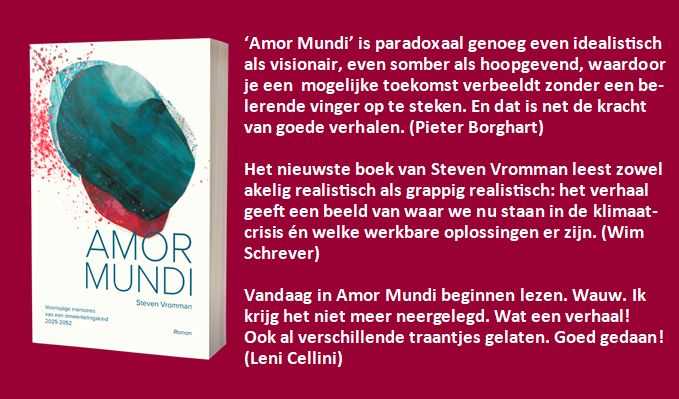 Het nieuwste boek van Steven Vromman, Amor Mundi, leest zowel akelig realistisch als grappig realistisch: het verhaal geeft een beeld van waar we nu al staan in de klimaatcris én in de werkbare oplossingen (waarvan er al veel worden toegepast, zoals Partago, Lousbergmarkt, LETS Vlaanderen en vele andere).En weet je wat? #Geraardsbergen sluit in het spannende verhaal (eindelijk) aan bij Gent (blz 113), bij de stadsregio #BeterGent. Mss hebben bezoeken van de Low Impact Man aan onze Denderstad toch een impact nagelaten en ziet hij welke potentie onze regio heeft in De Nieuwe Wereld? ;-} Het boek is bovendien een goede vertelling, met een hoopvolle blik op onze grauwe toekomst.