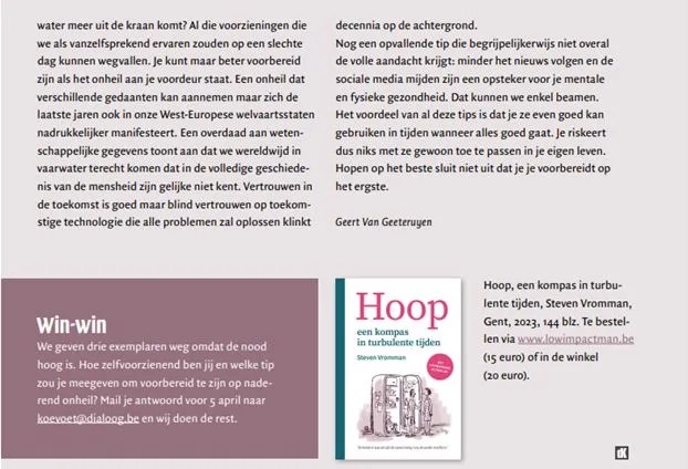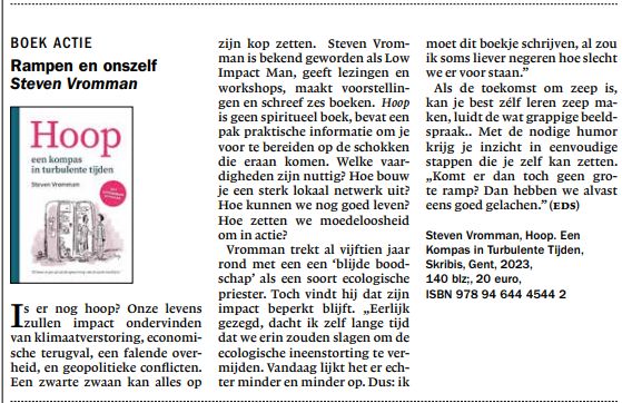 Steven Vromman schreef ‘een kompas in turbulente tijden’, en dat is zeker wel een accurate korte inhoud van zijn boek. Het boek schetst geen al te rooskleurig beeld van hoe het er op dit moment aan toe gaat in de wereld, en de (huidige en waarschijnlijke toekomstige) gevolgen daarvan op het klimaat, maar het is wel de realiteit. Ik zou het niet als doemdenkerij omschrijven. Veeleer zie ik het als een broodnodige wake-up call!